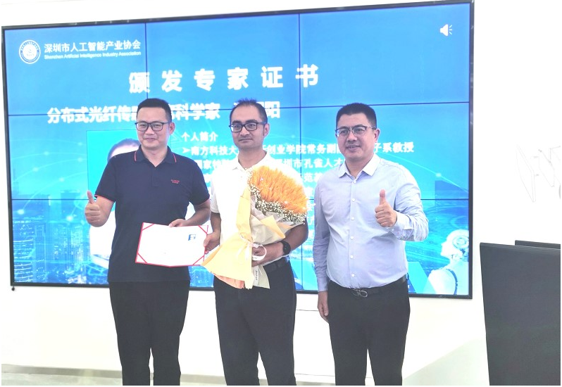 會議現(xiàn)場,人工智能產(chǎn)業(yè)協(xié)會范叢明執(zhí)行會長和智能傳感器專委會唐可信會長一起為南方科技大學(xué)創(chuàng)新創(chuàng)業(yè)學(xué)院常務(wù)副院長邵理陽教授頒發(fā)深圳市人工智能產(chǎn)業(yè)協(xié)會分布式光纖傳感首席科學(xué)家專家證書。