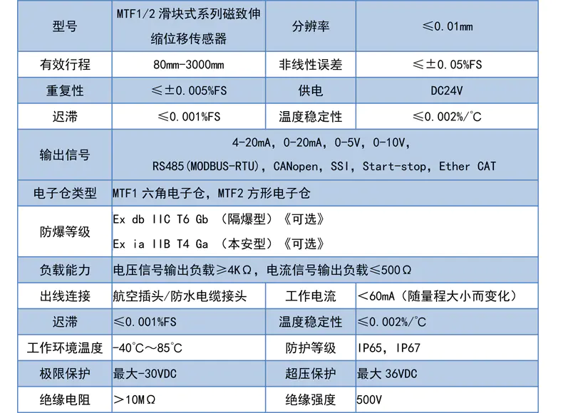 MTF1/2滑塊式磁致伸縮位移傳感器標(biāo)準(zhǔn)參數(shù):